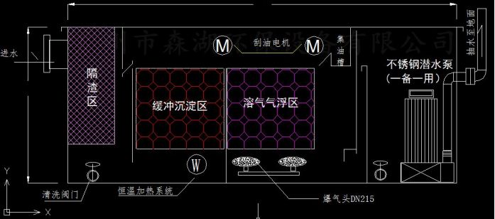 3. 污水流入油水分離腔,通過加熱使油污變得更有流動性,通過刮油裝置把油刮除到排油槽,廢油從溢流堰自然流出由廢油收集桶收集起來,定期清理廢油即可,這樣浮油得到去除。